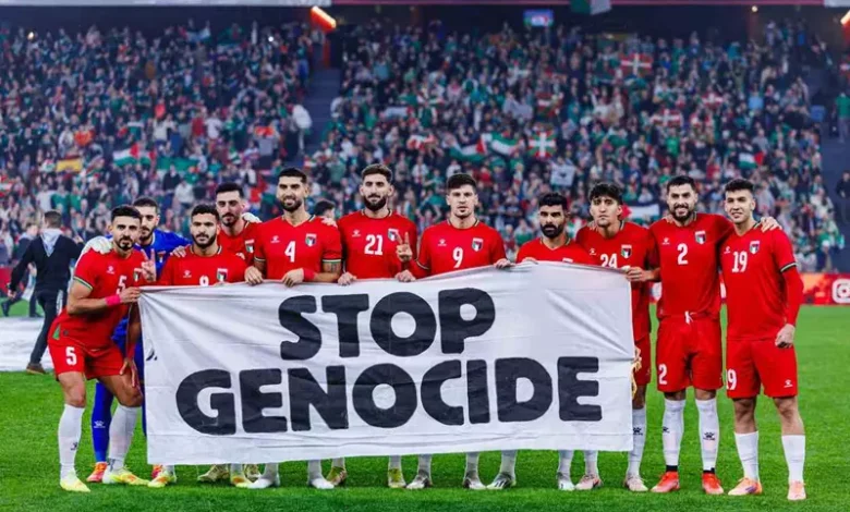 وكانت هناك لافتة حملها لاعبو فلسطين بعنوان (أوقفوا الإبادة الجماعية).